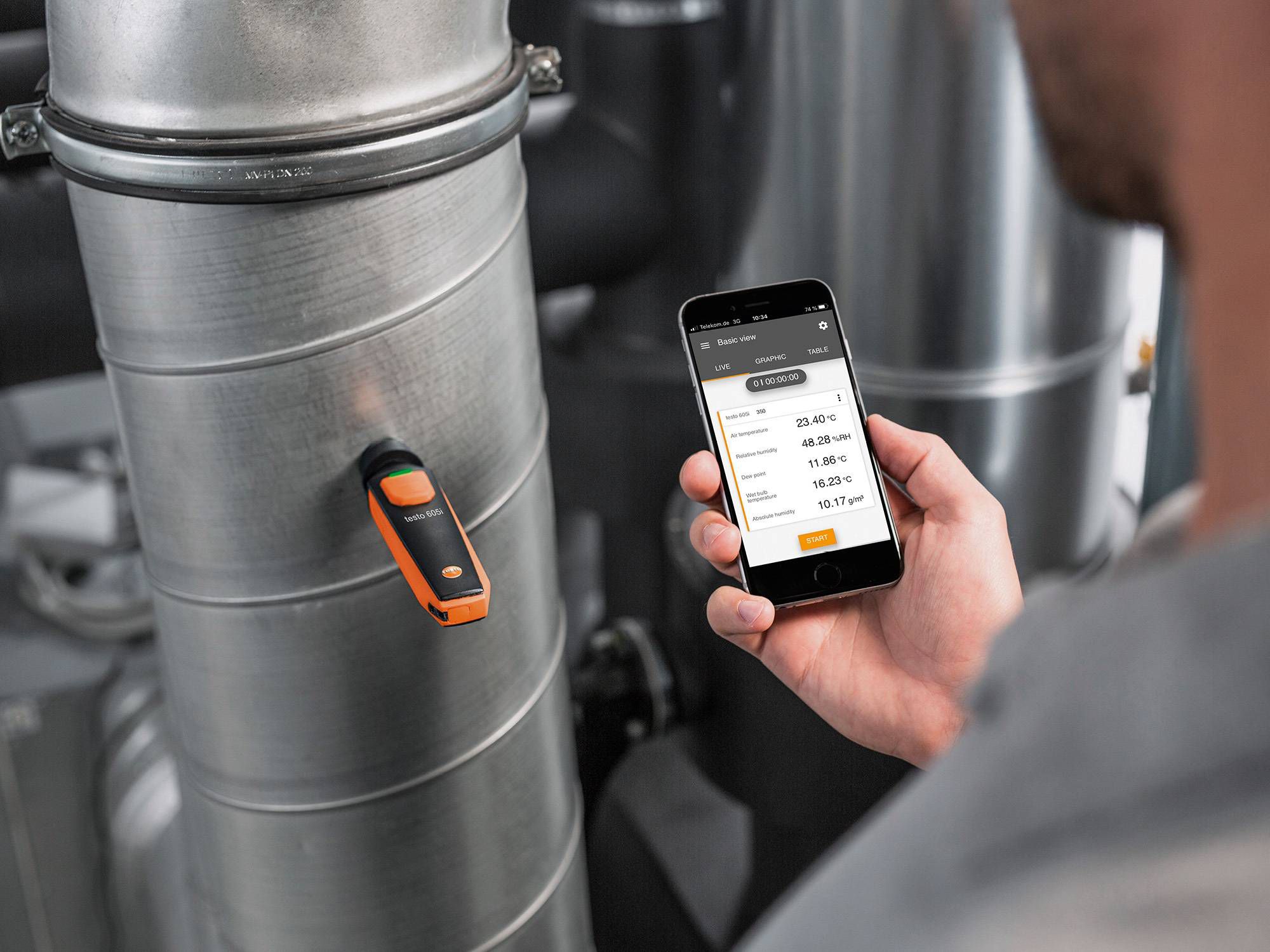 ve dijital dokümantasyon sayesinde önemli ölçüde zaman kazandırır. Buna ek olarak, kompakt cihaz sıcaklık, basınç ve nem için testo Smart uygulaması aracılığıyla Bluetooth® problarımıza otomatik olarak bağlanır. Uygulamada buharlaşma ve yoğuşma sıcaklıkları otomatik olarak hesaplanabilir. Elinizde akıllı telefonunuzdan başka hiçbir şey olmadığından, bir tarafa veya 150 m’ye kadar uzakta rahat bir şekilde duruyorsunuz.