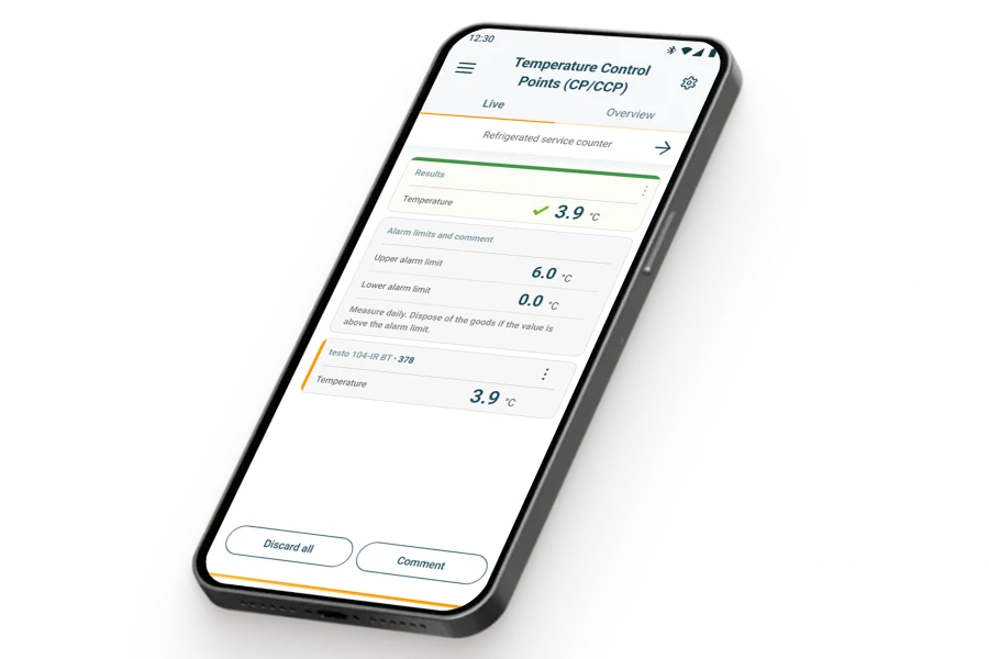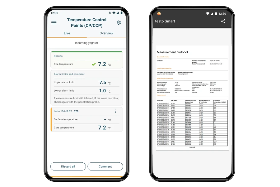Testo’nun Food BT serisi ile en katı gıda standartlarını karşılamak için düzenli kayıt tutmak çocuk oyuncağıdır. Artık sıkıcı, hataya açık evrak işlerine ihtiyaç duymadan dijital olarak belgeleyebilirsiniz; böylece değerli zamandan ve paradan tasarruf edersiniz. Tüm ölçüm sonuçları sorunsuz bir şekilde dijital olarak kaydedilir, Bluetooth aracılığıyla testo Smart App uygulamasına hatasız olarak iletilir ve izlenebilir bir şekilde belgelenir; CSV veri aktarımı olarak kağıtsız veya imza ve yorum fonksiyonu dahil PDF formatında profesyonel rapor.
