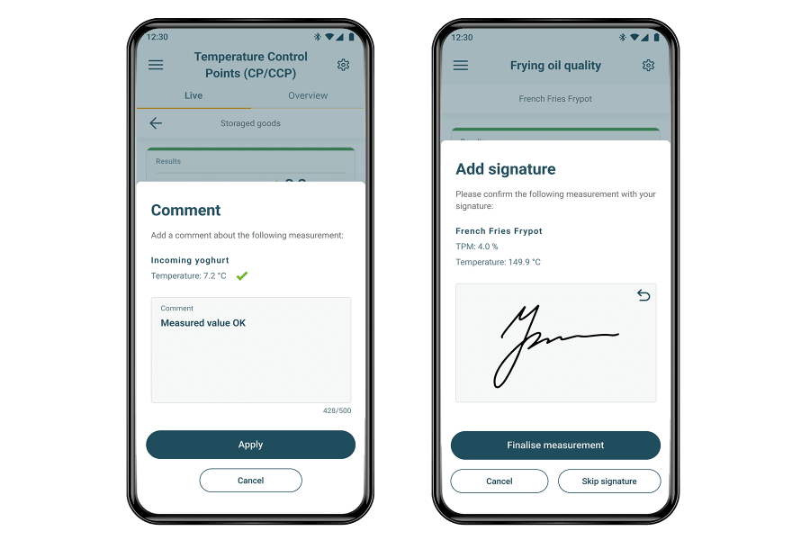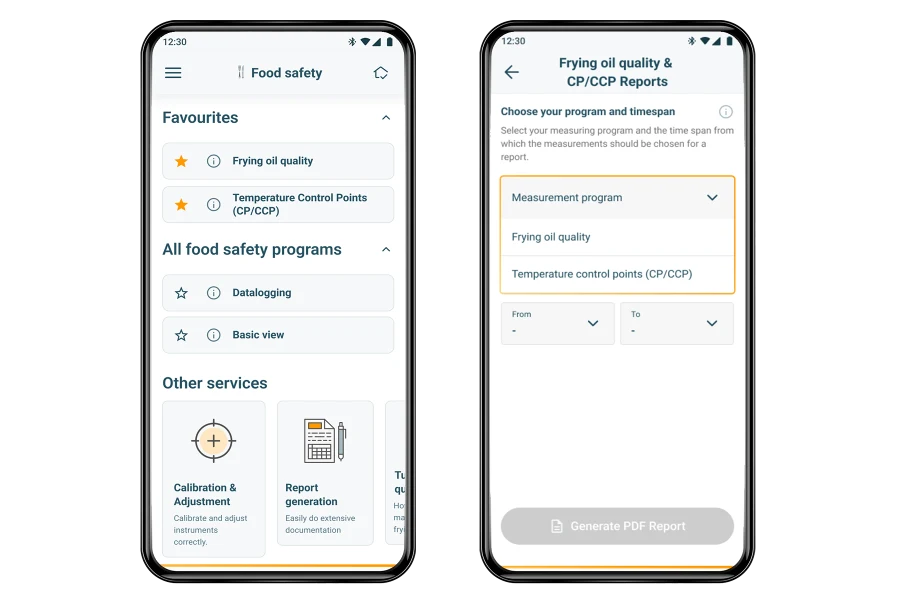 Evrensel ölçüm aralıkları: App ölçüm programı, kızartma yağının kalitesinden sıcaklık ve (kritik) kontrol noktalarına kadar gıda sektöründeki tüm ölçümler için kapsamlı destek sağlar. Hatasız dijital dokümantasyon garanti edilir.